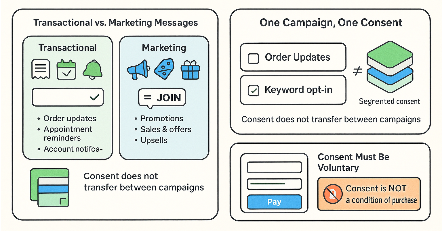 Consent applies to each campaign separately. If a customer signs up for order updates, that does not mean they agreed to receive promotional messages. You need separate opt-ins for each type of message. Combined consent is not allowed.