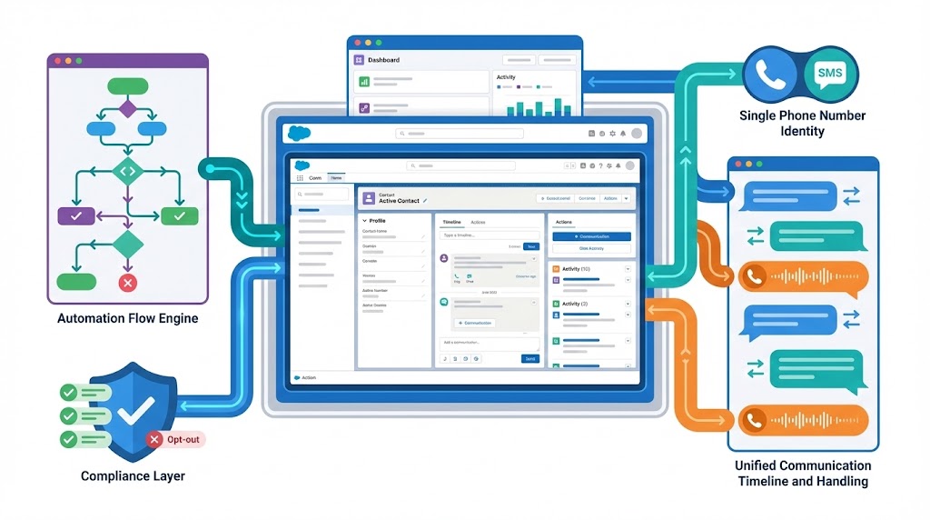 The practical solution: integrate a native AppExchange SMS app that works directly inside Sales Cloud, logs messages to standard objects, and triggers from Salesforce Flows.