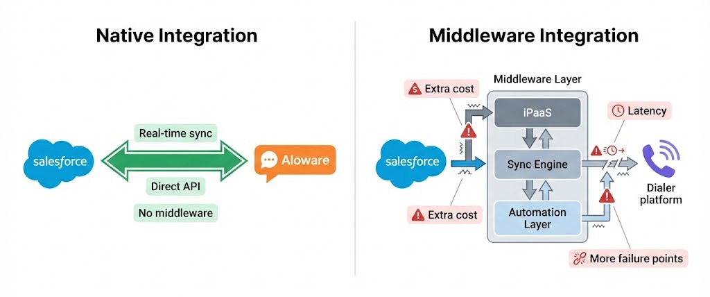 Key Takeaway: Native integration eliminates middleware costs and complexity. Your data flows directly between Aloware and Salesforce without third-party routing.
