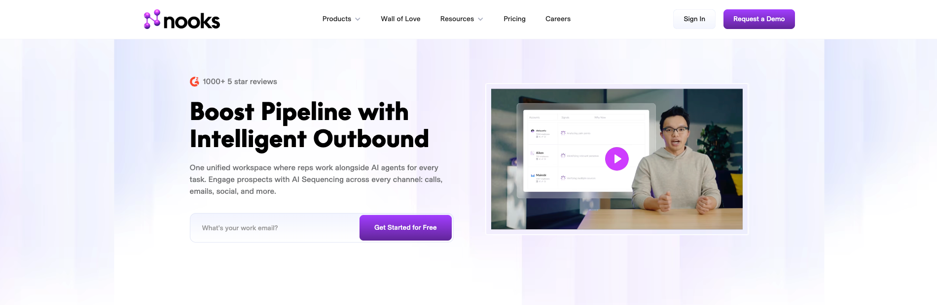 Nooks layers AI call coaching on top of a parallel dialing architecture similar to Orum's. Reps get real-time guidance during live calls alongside the volume benefits of simultaneous outbound lines. The platform is newer with a smaller integration library, but well-regarded in SDR-heavy SaaS environments.