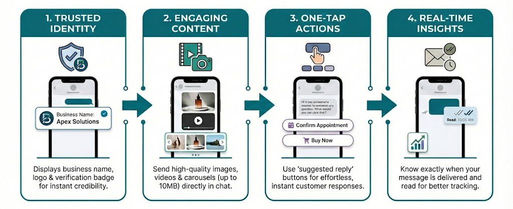 - Verified Sender IDs: Displays your business name, logo, and a verification badge instead of a random phone number.