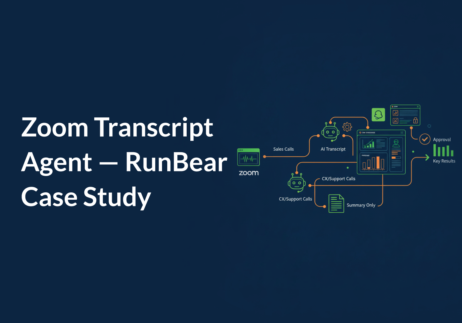 Built on RunBear, no custom code. Zoom and CRM connectors, team routing logic, and the Slack approval loop were all configured in RunBear's platform — no custom backend development required.