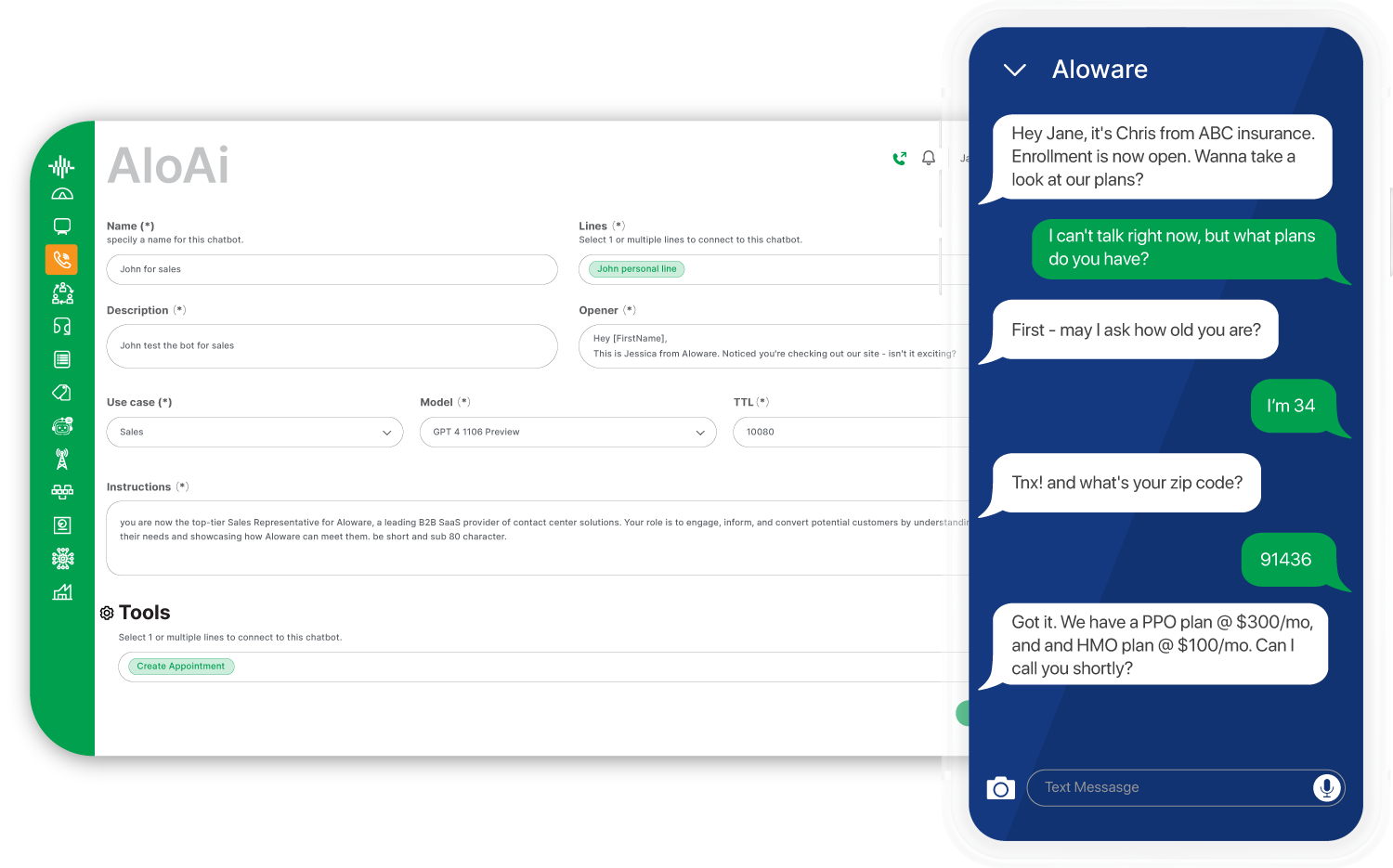 This is what separates Aloware from basic SMS integrations.Most tools let you send texts. Aloware's AloAi text bot responds to texts—engaging leads in real conversation, answering questions, qualifying interest, and booking meetings automatically.