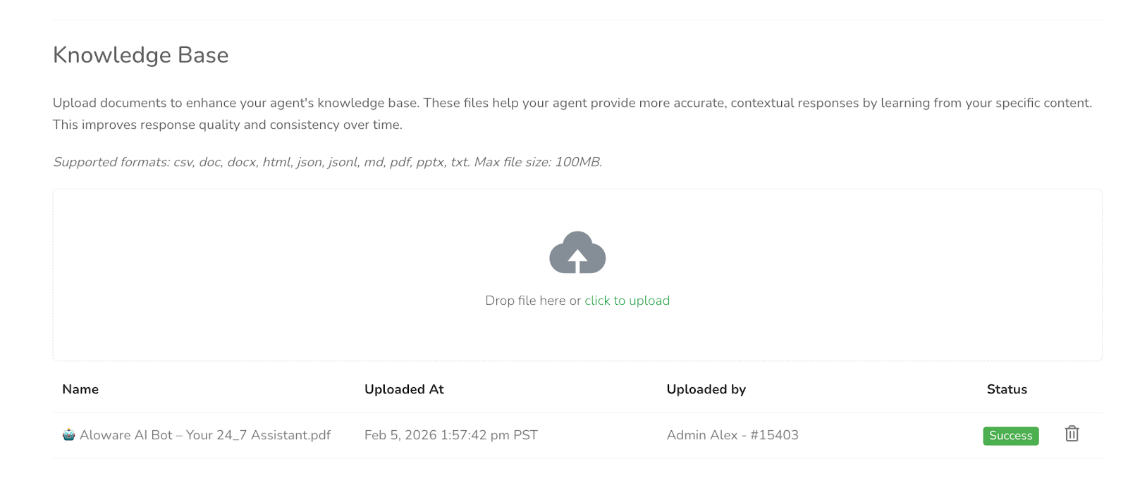 Admins can now access the Knowledge Base directly within the agent instruction flow, instead of a separate tab. This change keeps knowledge management in the same context where agent behavior is configured, simplifying setup and navigation. Existing data remains unchanged, while the updated interface provides clearer guidance and structure for configuring both Voice and Text Agents.
