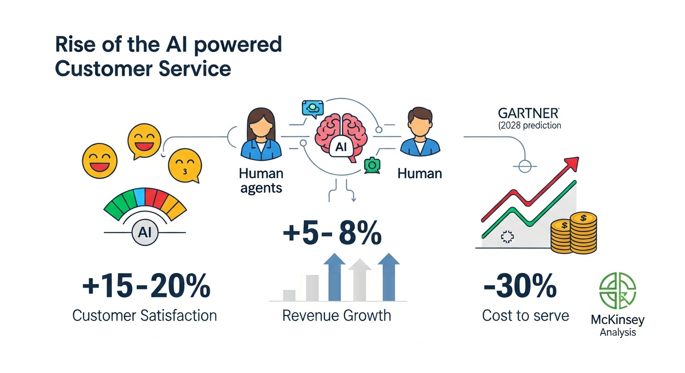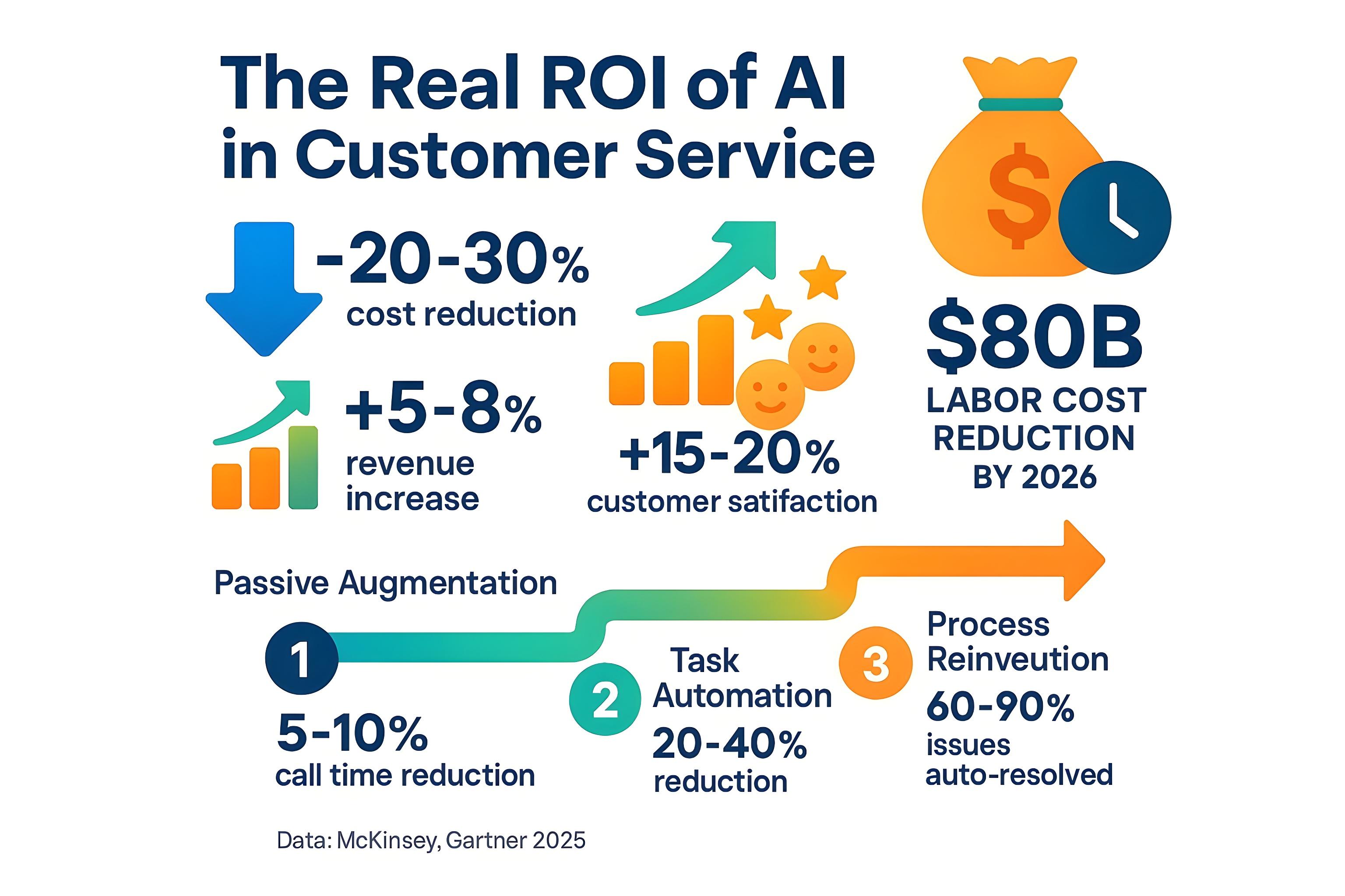 At a high level, the business impact is significant. As established, McKinsey's analysis shows that AI can reduce service costs by 20-30%, increase revenue by 5-8%, and improve customer satisfaction scores by 15-20%. On the cost side, Gartner projects that by 2026, contact centers will reduce agent labor costs by a staggering $80 billion through the strategic deployment of conversational AI.
